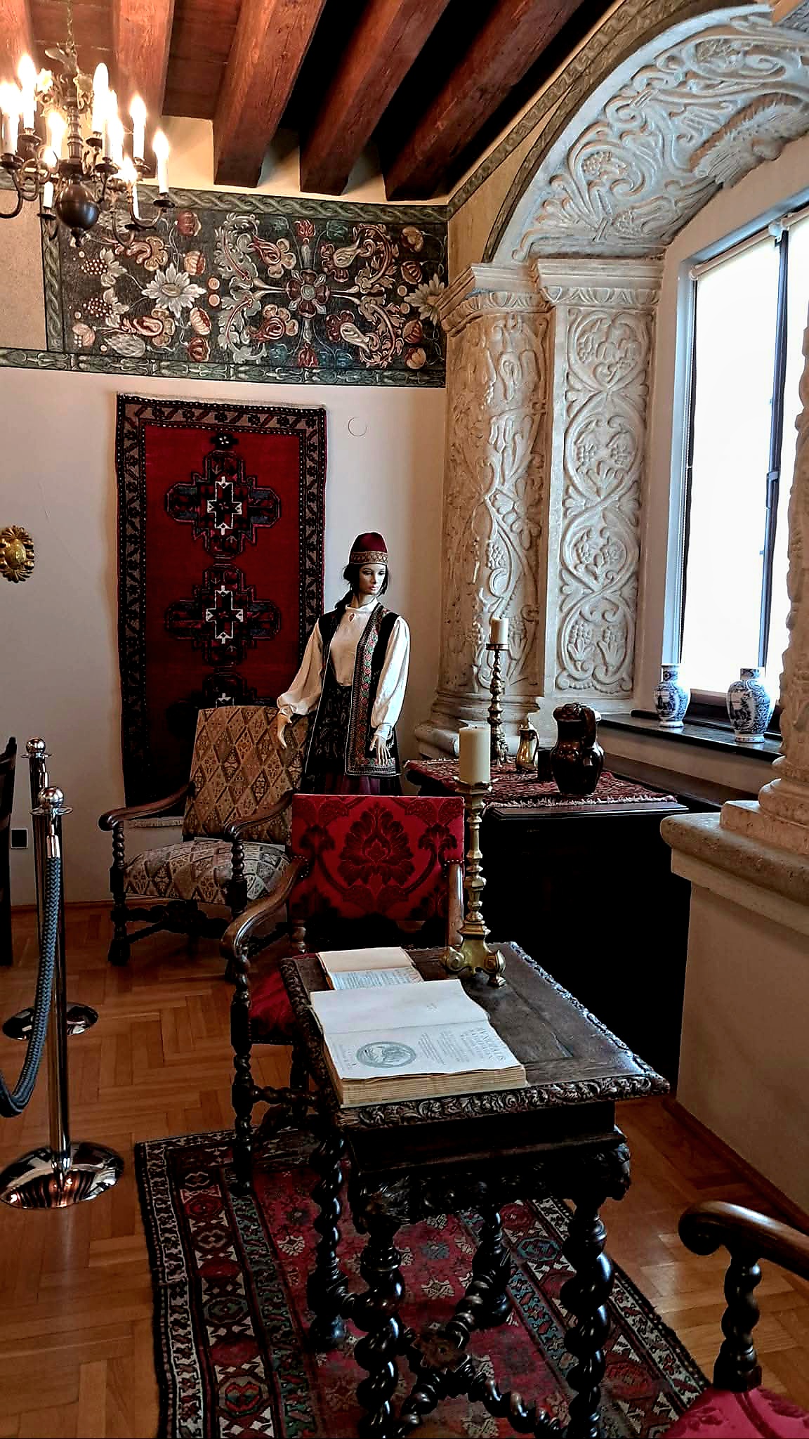 W sposób szczególny poeta opisał kaplicę Zamoyskich, która wyłożona była karmazynowym aksamitem, czyli tkaniną w głębokim odcieniu czerwieni. Materiał ten nadawał wnętrzu splendoru i podkreślał rangę rodu fundatorów. Na obiciach, po lewej stronie kaplicy, zawieszone były portrety przedstawicieli rodziny Zamoyskich, ordynatów, począwszy od Jana Wielkiego, a skończywszy na VIII ordynacie, Klemensie Zamoyskim.