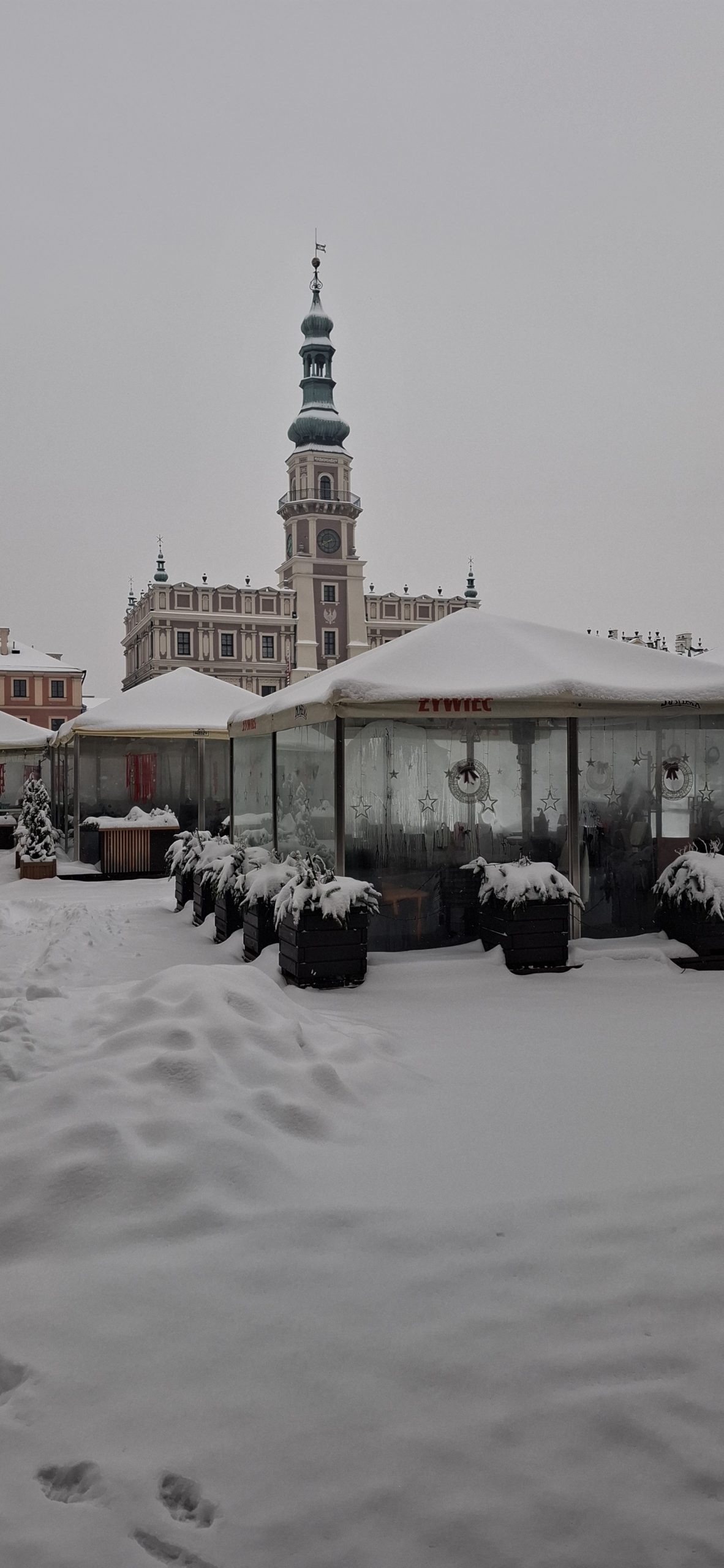 Rynek, cichy i spokojny po nocnych opadach, zaprasza na zimowy spacer.
