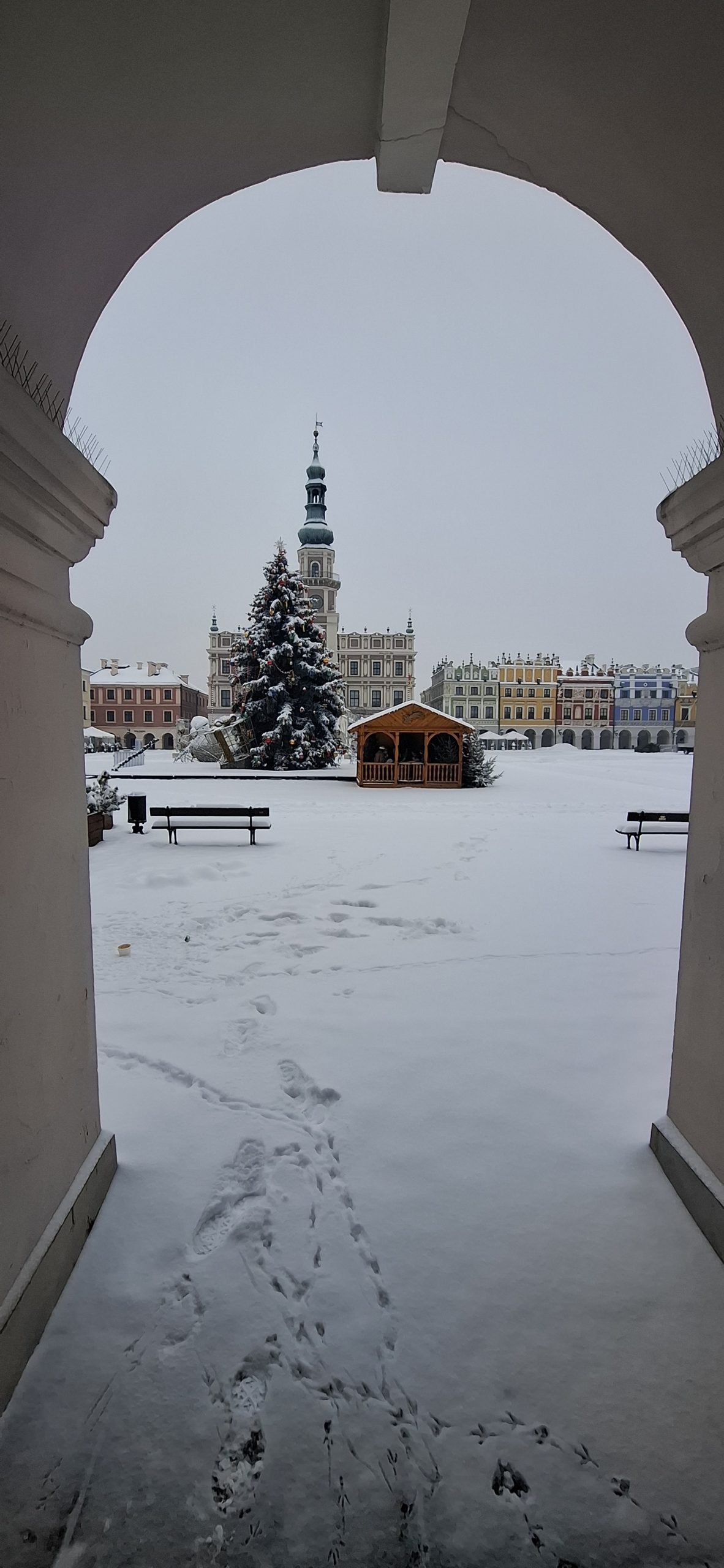 Ratusz Zamojski wygląda wyjątkowo dostojnie, gdy jego fasada kontrastuje z czystą bielą placu.